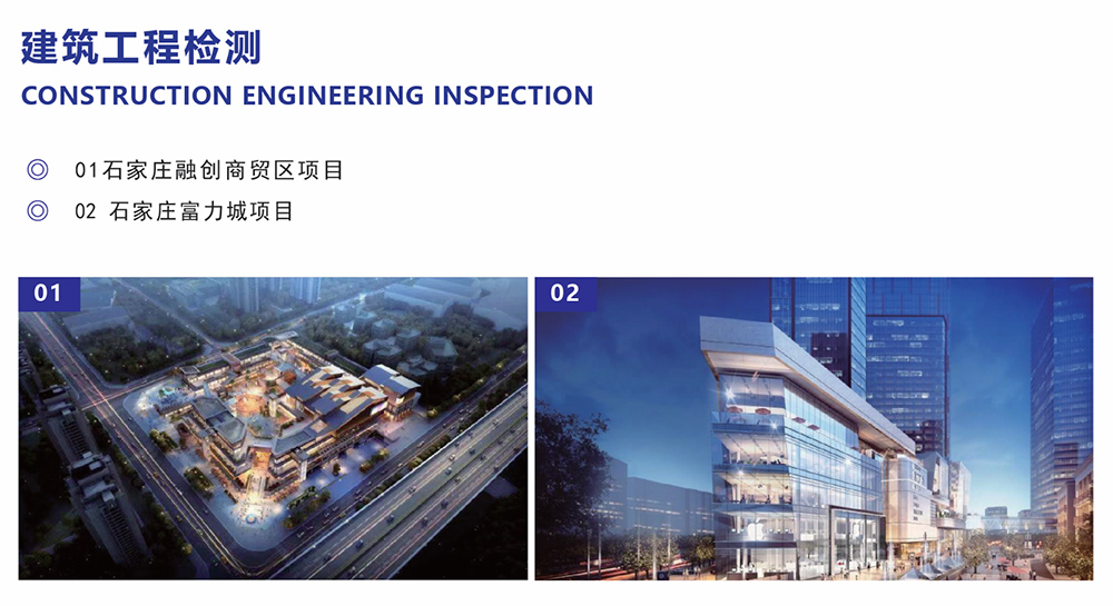 主體結構工程檢測項目:1.混凝土、砂漿、砌體強度現場檢測;2.鋼筋保護層厚度檢測;3.混凝土預制構件結構性能檢測;4.后置埋件的力學性能檢測。