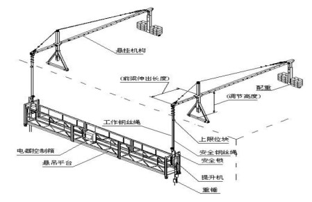 組成:高作作業吊籃一般由懸吊平臺、懸掛機構(含配重)、提升機、安全鎖、電氣控制箱、鋼絲繩等部件及配件組成
