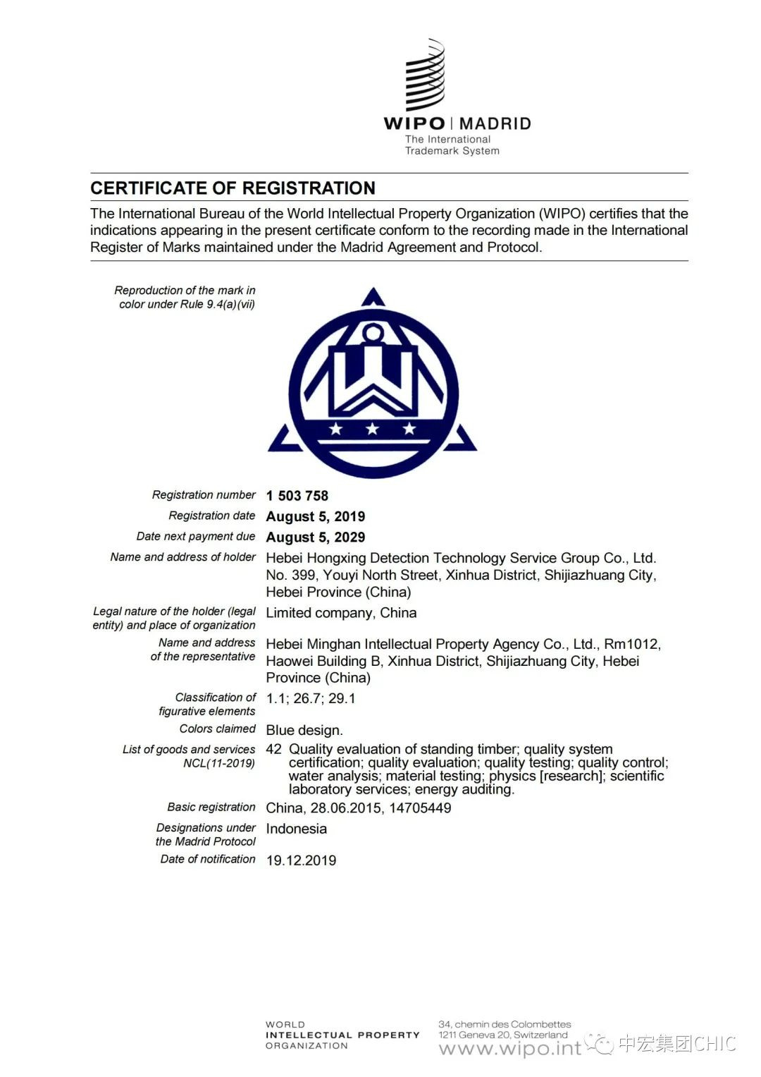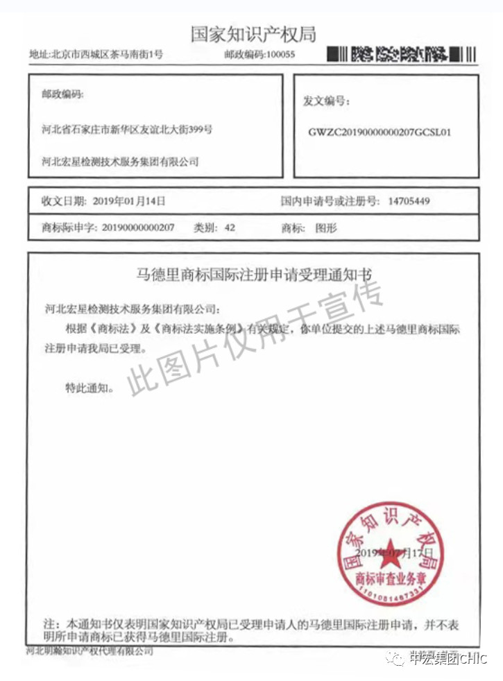 金秋九月,碩果豐收,在這收割和播種之際,公司收獲果實滿滿,近日,中宏檢驗認證集團有限公司順利通過馬德里體系國際商標注冊。